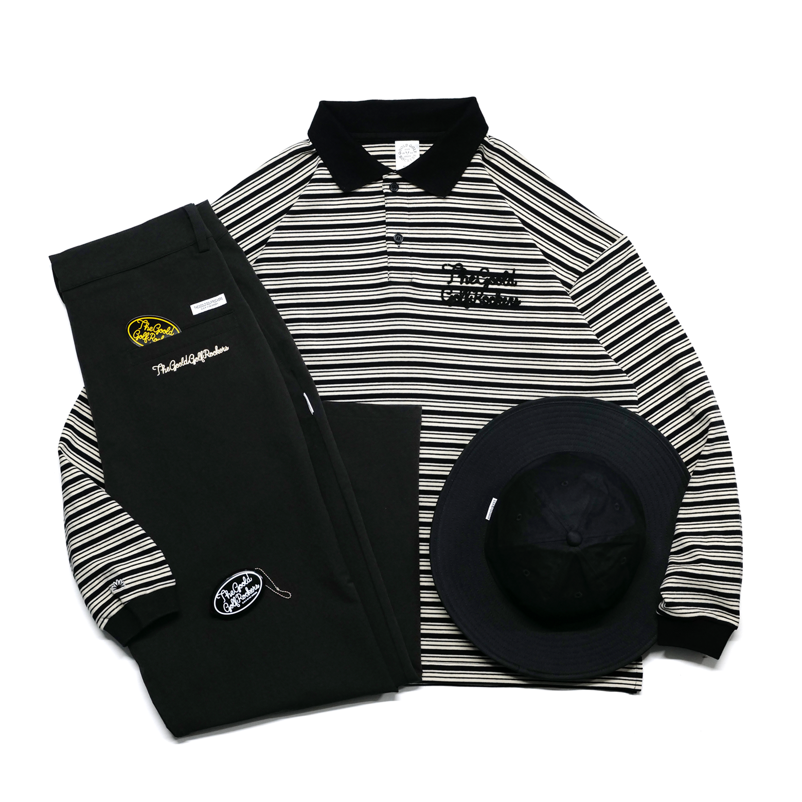 セット内容は、ロングブリムハット・ポロシャツ・2タックパンツ・コインケースの4点セット。