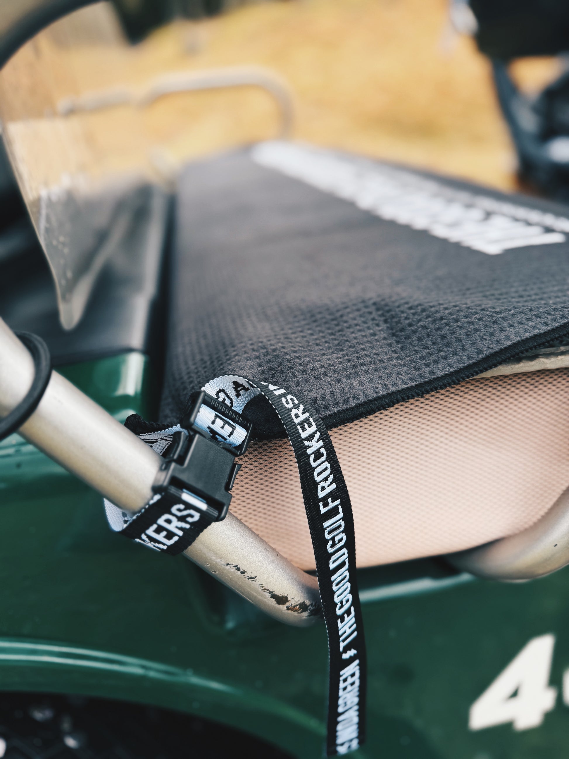 リーバシブル仕様になっているベルト付きのゴルフカートシートカバー。